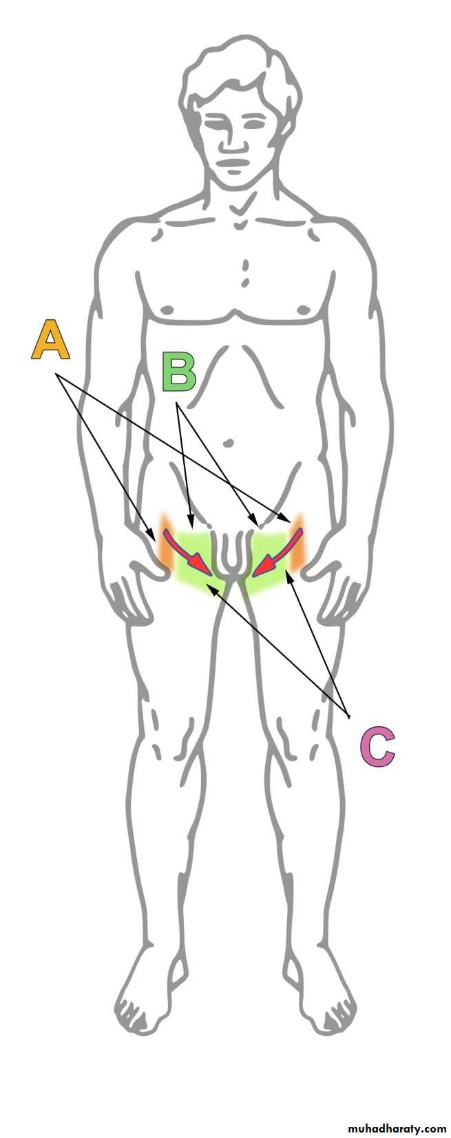 Area A (orange): area of sensory fibers controlled by the genitofemoral nerveArea B (green): area of sensory fibers controlled by the ilioinguinal nerve