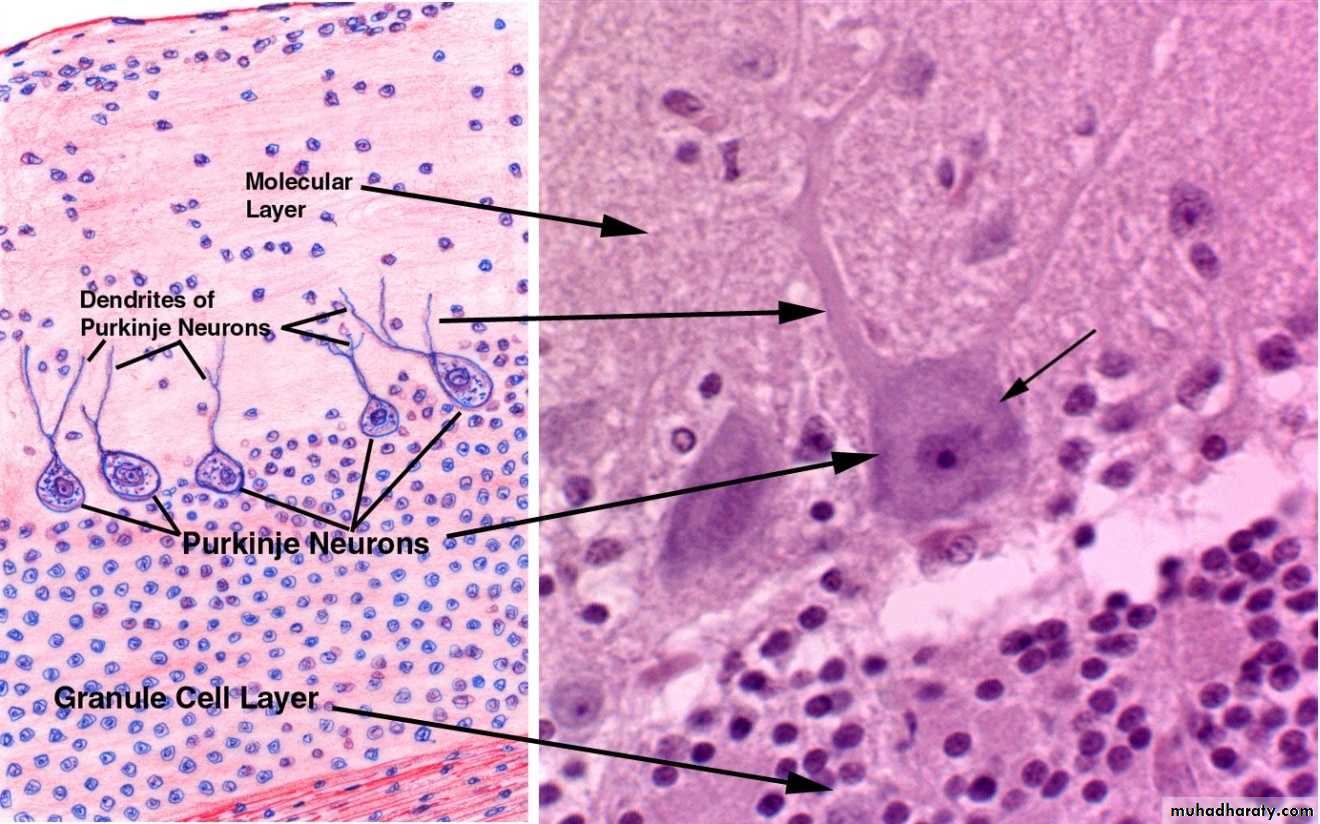 Purkinje cells are large flask-shaped neurons (Golgi type I) and are arranged in a single row between molecular and granular layers.