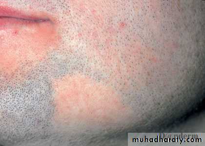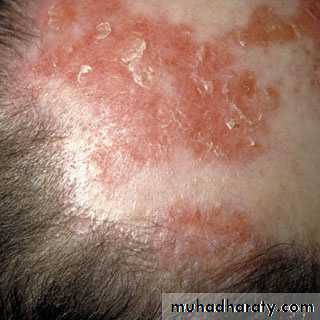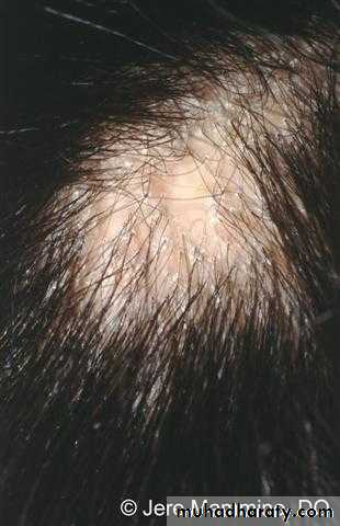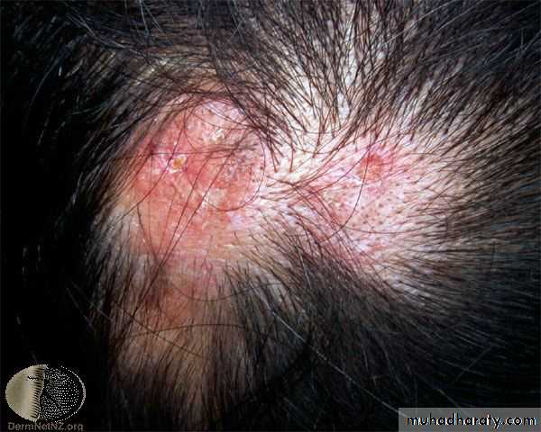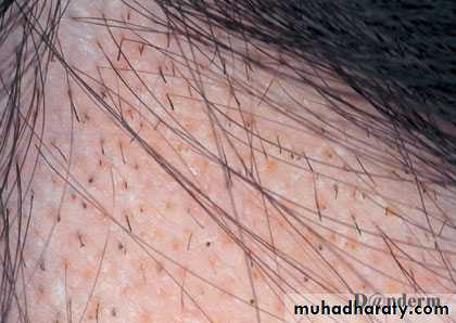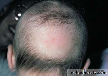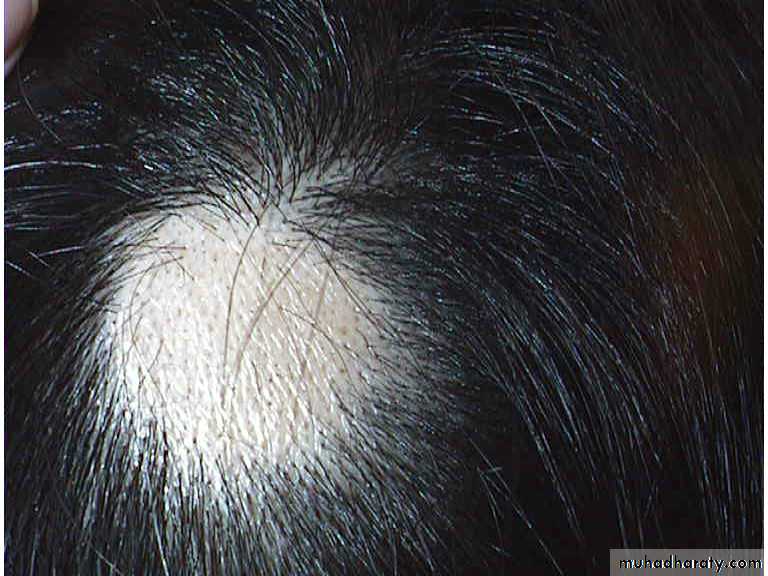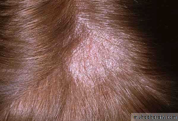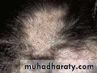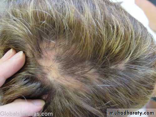 • The bald area show short broken hairs, folliculitis & sometime scarring.