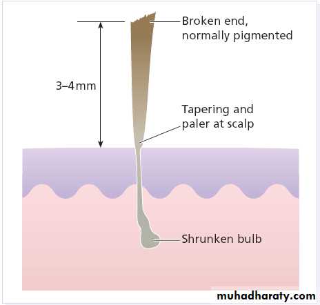 • Premature termination of anagen & high number of normal hairs enter the resting telogen phase.• Usually no more than 50% of the hair is affected.