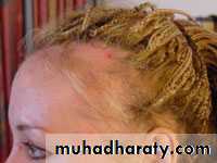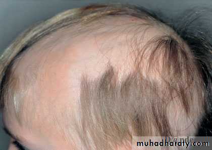 • Trichotillomania ( Hair-pulling habit ) is a discomfort habit in children like nail-biting and lip-licking. It is a type of traumatic localized non-scarring alopecia not uncommonly seen in children and occurs more in girls than in boys.