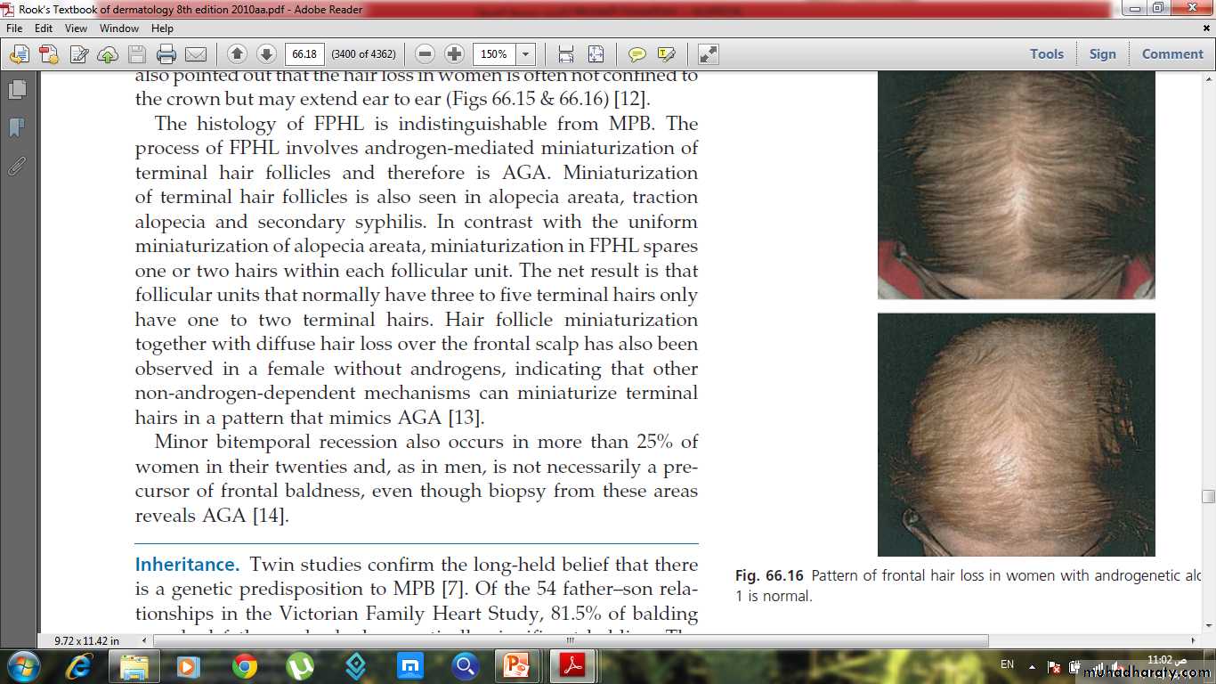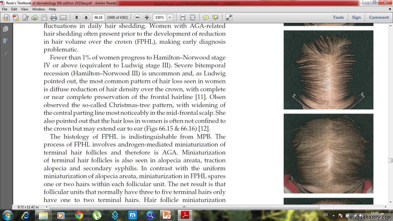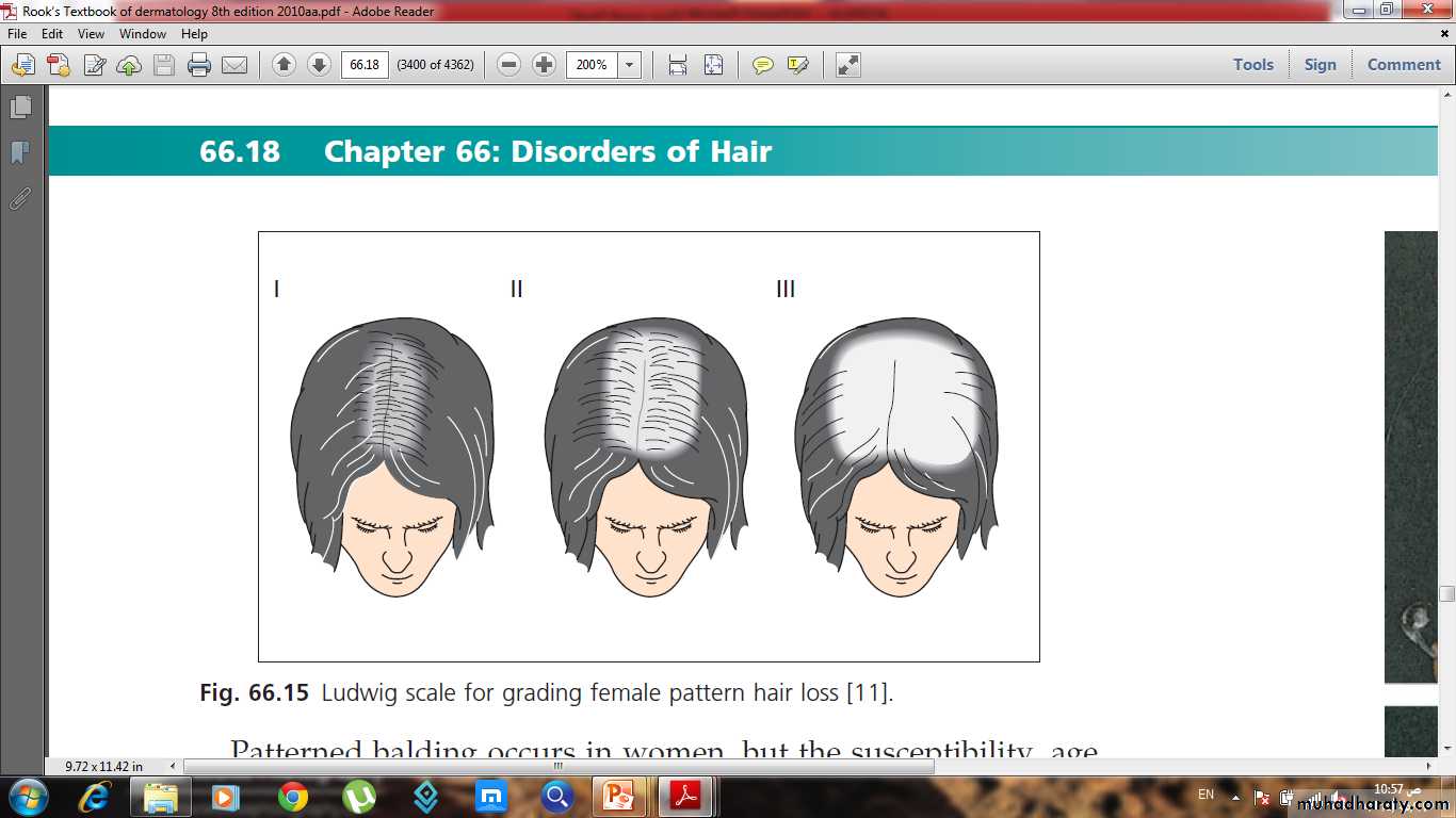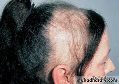 • In females, diffuse thinning of the fronto-vertical hair with preservation of the frontal line.There may be a moderate loss of hair on the crown,