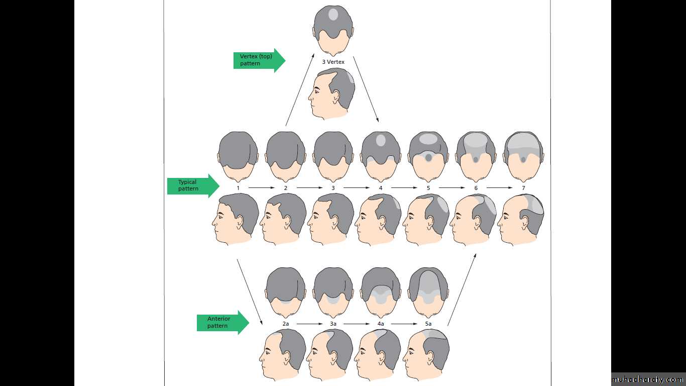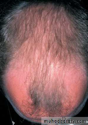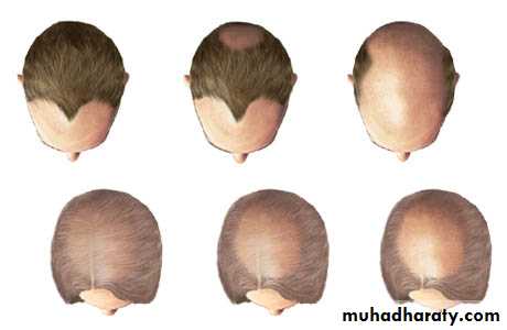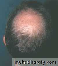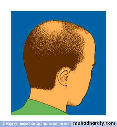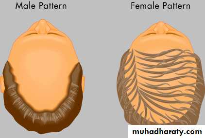 There is gradual loss of hair on the central scalp, with retention of the normal hair line without fronto-temporal recession.Differ from male pattern baldness: