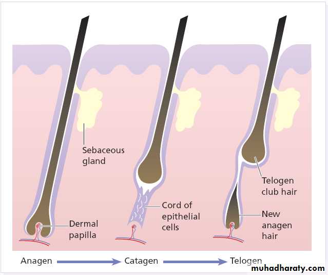 • Telogen: A resting phase at the end of which the club hair is shed. last about 3 months. Account 14% of scalp hair.