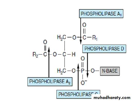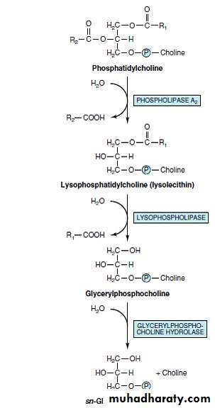 Although phospholipids are actively degraded, each portion of the molecule turns over at a different rate . Phospholipase A2 catalyzes the hydrolysis of glycerophospholipids to form a free fatty acid and lysophospholipid, which in turn may be reacylated by acyl-CoA in the presence of an acyltransferase. Alternatively, lysophospholipid (eg, lysolecithin ) is attacked by lysophospholipase, forming the corresponding glyceryl phosphoryl base, which in turn may be split by a hydrolase liberating glycerol 3-phosphate plus base. Phospholipases A1, A2, C, and D attack lipid bonds . Phospholipase A2 is found in pancreatic fluid and snake venom as well as in many types of cells; phospholipase C is one of the major toxins secreted by bacteria; and phospholipase D is known to be involved in mammalian signal transduction.Long-chain saturated fatty acids are found predominantly in the 1 position of phospholipids, whereas the polyunsaturated acids (eg, the precursors of prostaglandins) are incorporated more into the 2 position.