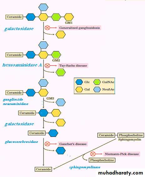 Gangliosides are degraded by a set of lysosomal enzymes that catalyze the stepwise removal of sugar units, finally yielding a ceramide. A genetic defect in any of these hydrolytic enzymes leads to the accumulation of gangliosides in the cell, with severe medical consequences .