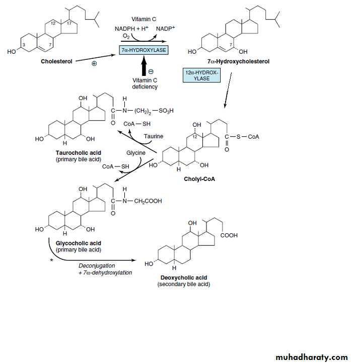 The primary bile acids are synthesized in the liver from cholesterol. These are cholic acid (found in the largest amount) and chenodeoxycholic acid . Primary bile acids are those synthesized by the liver. Secondary bile acids result from bacterial actions in the colon. A portion of the primary bile acids in the intestine is subjected to further changes by the activity of the intestinal bacteria.