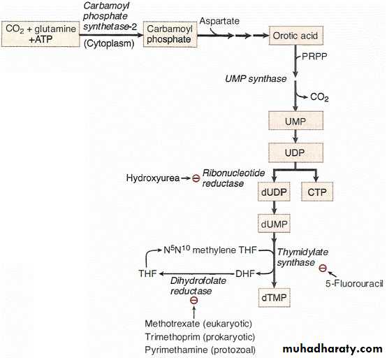 The primary end product of pyrimidine synthesis is UMP. In the conversion of UMP to dTMP, three important enzymes are ribonucleotide reductase, thymidylate synthase, and dihydrofolate reductase. All three enzymes are targets of antineoplastic drugs .