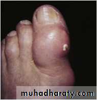 Acute gouty arthritis, seen most commonly in males, results from precipitation of monosodium urate crystals in joints. The crystals, identified as negatively birefringent and needle-shaped, initiate neutrophil mediated and acute inflammation, often first affecting the big toe. Chronic gout may manifest over time as tophi (deposits of monosodium urate) develop in soft tissue around joints, leading to chronic inflammation involving granulomas.