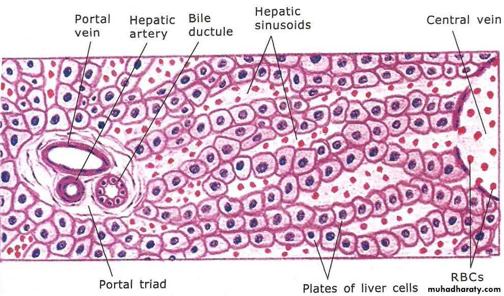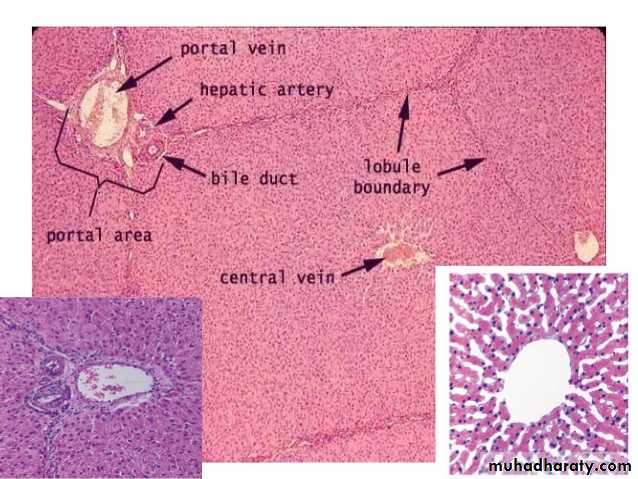 • Portal canals contain branches of portal vein, hepatic artery & interlobular bile duct (portal triad).• Central vein: in the centre of each lobule, conduct blood from lobules into hepatic veins.