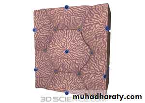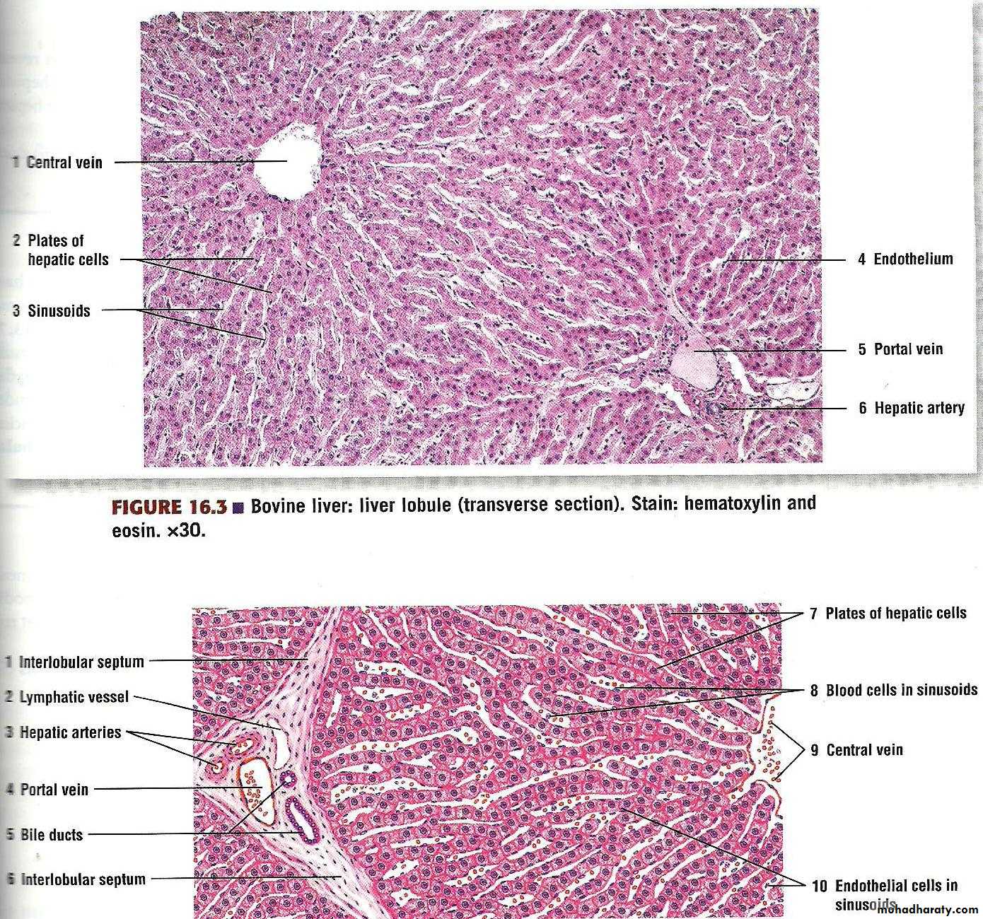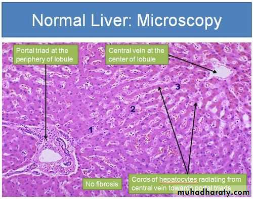 • Hepatic lobules: hexagonal areas that form the structural & functional unit of liver.