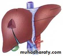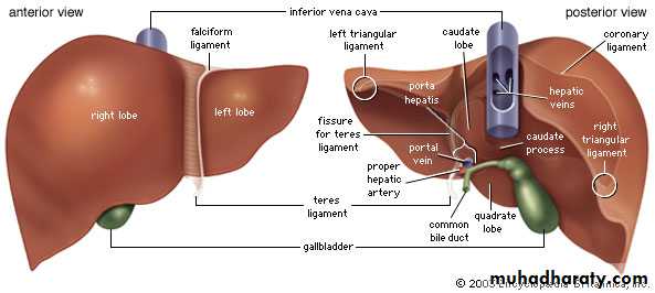 Blood carried away by the hepatic vein.It is connected to the diaphragm and abdomainal walls by five ligaments.