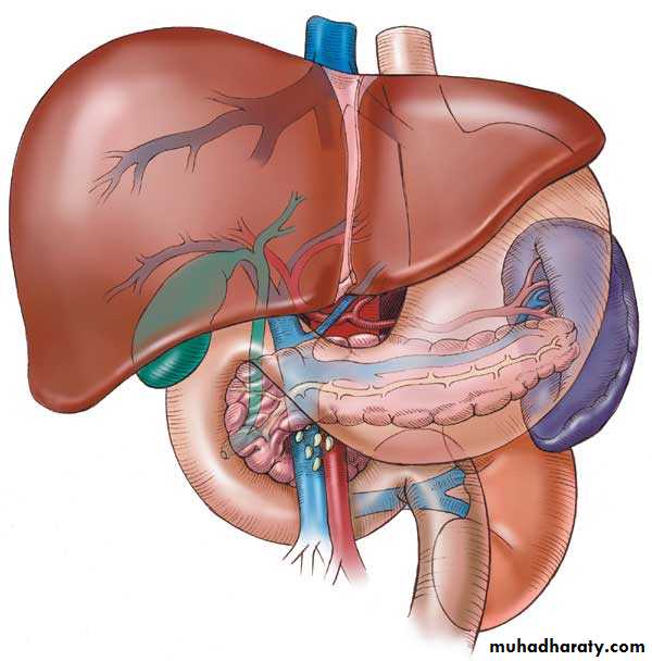 The liver is divided into four lobes: the right (the largest lobe), left, quadrate and caudate lobes.Supplied with blood via the portal vein, hepatic artery.