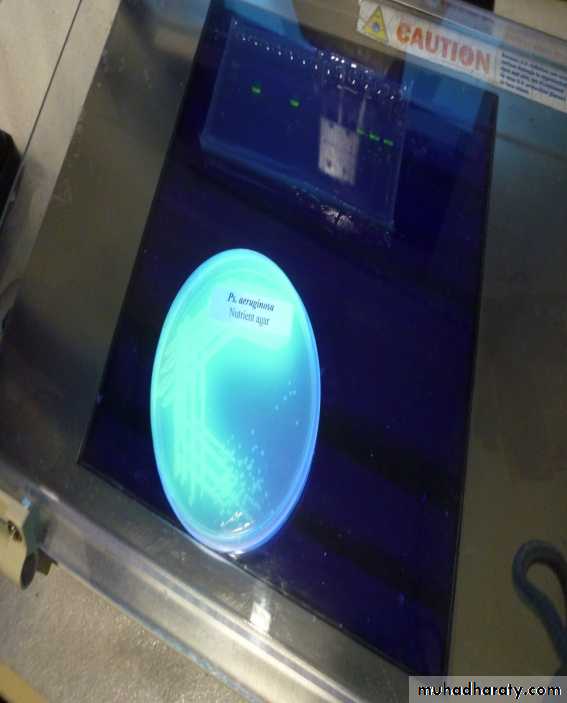 6-Fluorescence under ultraviolet light is helpful in early identification of P. aeruginosa colonies. Fluorescence is also used to suggest the presence of P. aeruginosa in wounds.