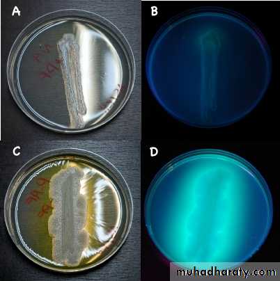 1-Pyocyanin (bluish pigment) ; 2-Pyoverdin (greenish pigment);