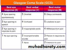 Scores of 13 to 14 indicate mild head injury, 9 to 12 moderate injury, and 4 to 8 as severe head injury