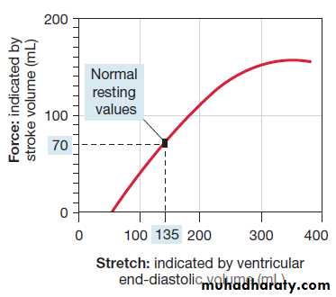 The relation between the initial length of the muscle fibers and the developed force is given by Starling’s law of the heart, which states that, within limits, the force of ventricular contraction depends on the end-diastolic length of the cardiac muscle; in the intact heart the latter relates closely to the ventricular end-diastolic volume. The volume present at the end of diastole, in turn, depends on the volume returned to the heart, or the venous return. Therefore, stroke volume and cardiac output correlate directly with end-diastolic volume, which correlates with venous return. The Frank-Starling relationship governs normal ventricular function and ensures that the volume the heart ejects in systole equals the volume it receives in venous return. Or, stated another way: Within physiologic limits, the heart pumps all the blood that returns to it by the way of the veins. However, when the returning blood does become more than the physiological limit of the pumping capacity of the ,or when the pumping capacity of the heart is reduced due to disease of the heart (heart failure), under such condition the heart becomes the limiting factor that determines cardiac output.