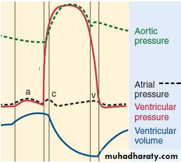 Excitation of the ventricles occurs as the wave of excitation passes through the AV node, bundle of His and Purkinje system. Ventricular contraction coinciding with the peak of the R-wave of the ECG, in response to contraction of the muscle, the ventricular pressure rises very rapidly this is not true isometric contraction, as some fibers lengthen and others shorten as the ventricle changes shape. the increasing intraventricular pressure lead to closure of the mitral and tricuspid valves, producing the first heart sound. the rapid rise in ventricular pressure is transmitted across the semilunar valves and appears as a small rise in the aortic pressure trace.