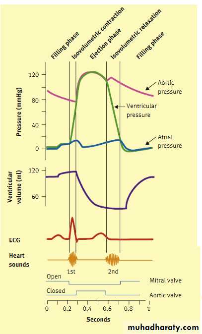 1.LV is first to start contraction and the last to start to fill. RV contraction lags due to the anatomy of the conducting system by ~ 15 ms. The pulmonary valve opens first, and pulmonary flow begins around 10 ms before aortic due to the lower pressure in the pulmonary circuit