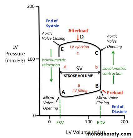 Figure 3 shows the cardiac cycle of the left ventricle, represented by plotting pressure against volume to produce a loop. At point A, the ventricle contains the end-systolic blood volume, and the mitral valve opens. The ventricle fills until end-diastolic volume is achieved at point B, where the mitral valve is closed by the onset of ventricular contraction. Isovolumic contraction increases pressure to point C, which corresponds to diastolic blood pressure and opening of the aortic valve. Ventricular ejection propels pressure through its peak value at point D, corresponding to aortic systolic pressure, until the aortic valve closes at point E. Pressure decreases back to point A during isovolumic relaxation, completing one cardiac cycle. The width of the pressure-volume loop is the stroke volume (the difference between end-diastolic volume and end-systolic volume).