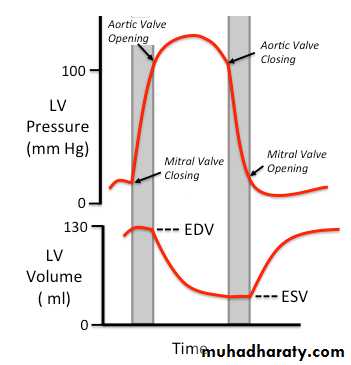 Excitation of the ventricles occurs as the wave of excitation passes through the AV node, bundle of His and Purkinje system. Ventricular contraction coinciding with the peak of the R-wave of the ECG, in response to contraction of the muscle, the ventricular pressure rises very rapidly this is not true isometric contraction, as some fibers lengthen and others shorten as the ventricle changes shape. the increasing intraventricular pressure lead to closure of the mitral and tricuspid valves, producing the first heart sound. the rapid rise in ventricular pressure is transmitted across the semilunar valves and appears as a small rise in the aortic pressure trace.figure1: ventricular pressure and volume curve.