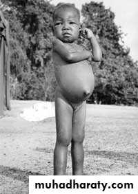 As protein deprivation continues, growth failure, loss of muscle mass, generalized swelling (edema), and decreased immunity occur.Swollen and severely bloated abdomen d/t edema from decreased albumin in the blood, skin changes resulting in a loss of color or a reddish discoloration of hair.