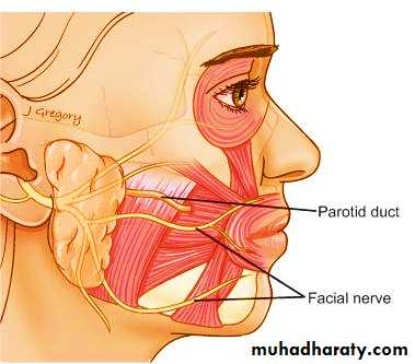 The duct is represented by the middle 1/3 of a line extending from the tragus of the auricle to a point midway between the ala of nose & upper lipStructures Coursing Within the Parotid Gland