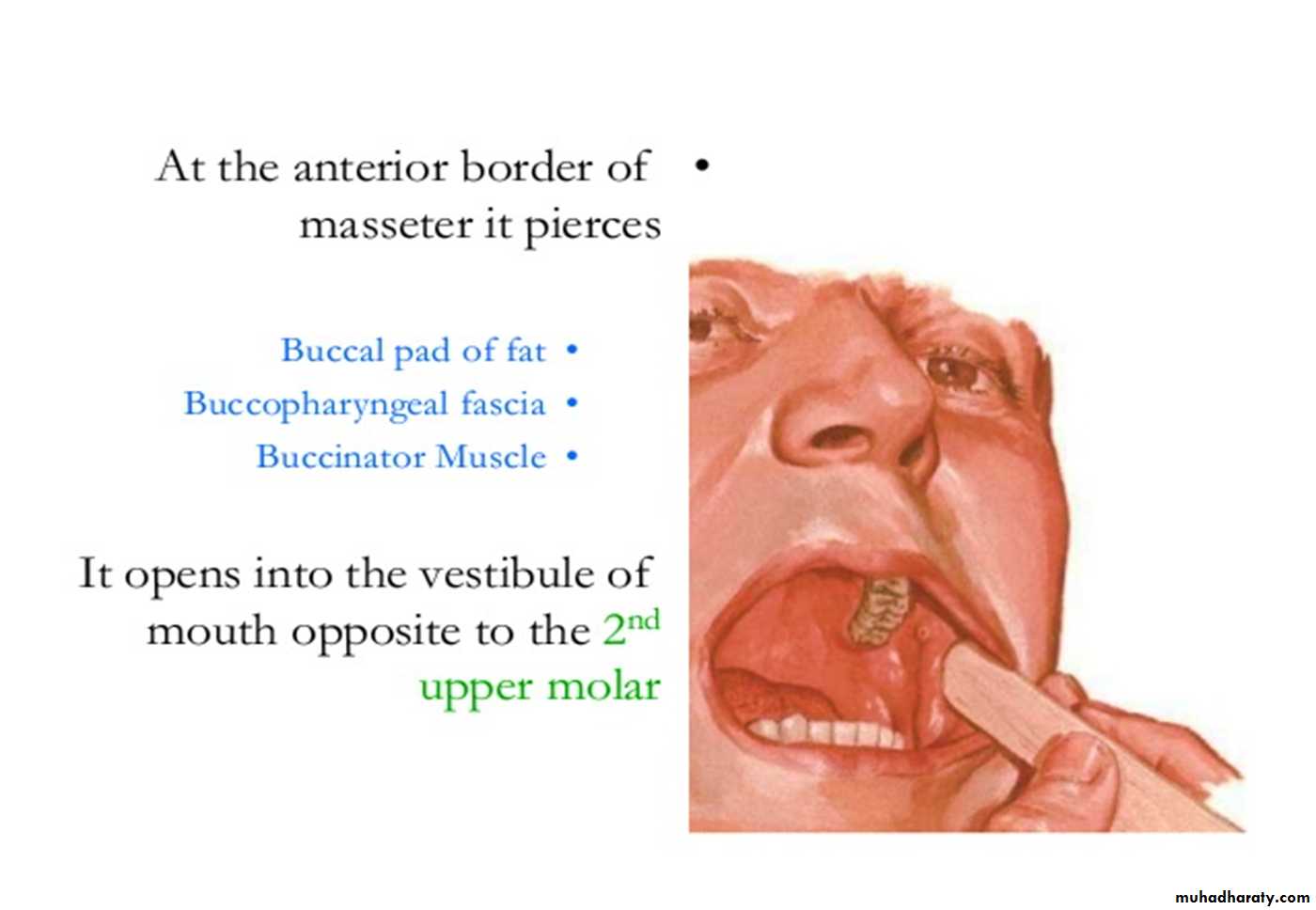 Opens into the vestibule of mouth on a small papilla, opposite the second upper molar tooth