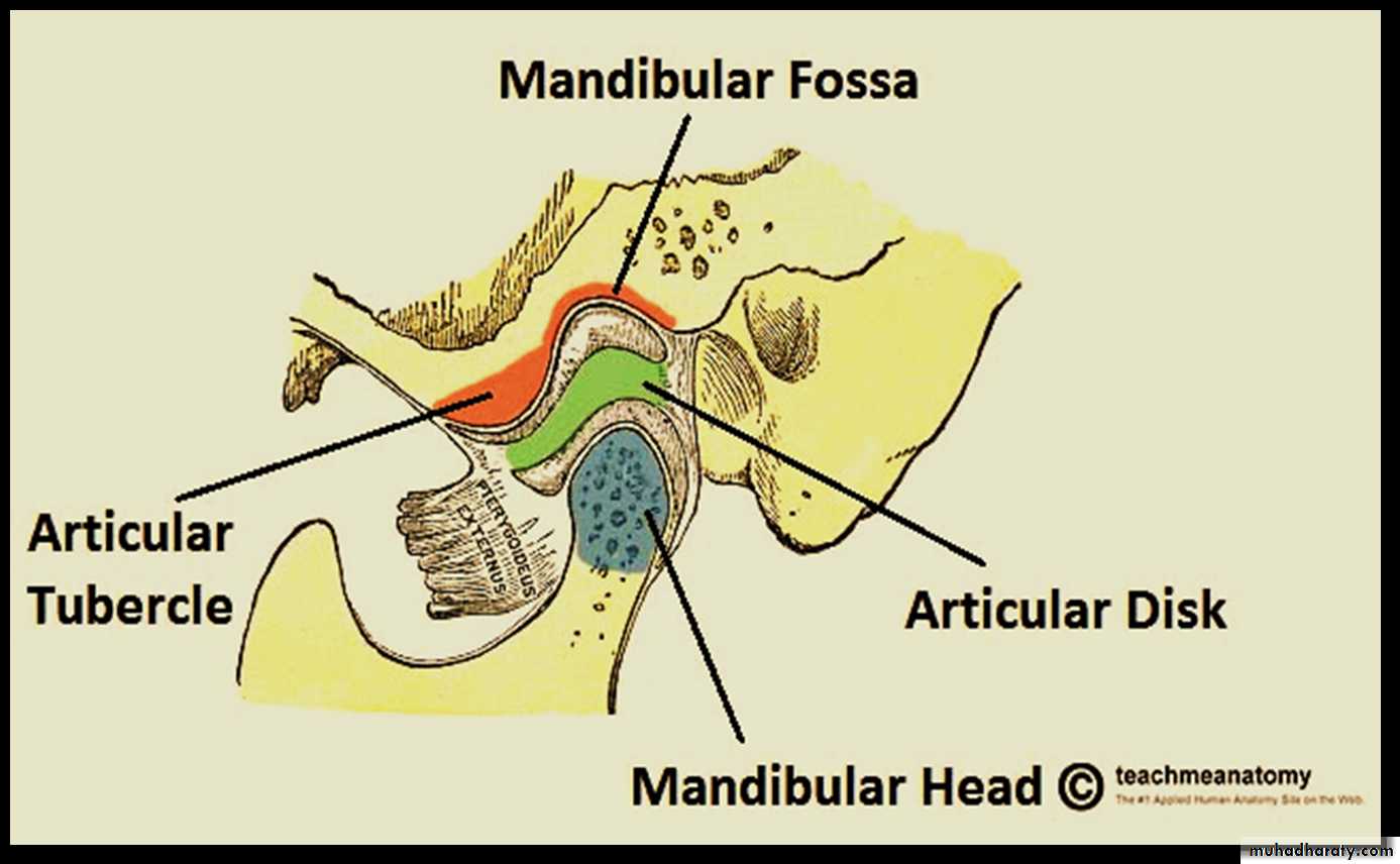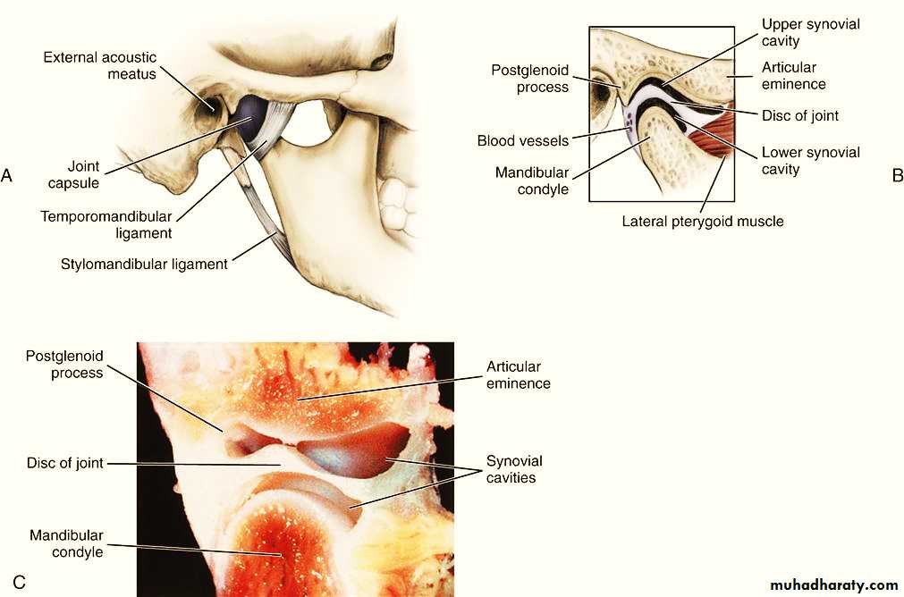 The joint cavity is divided by the articular disc (fibrocartilage ) into upper & lower cavities.