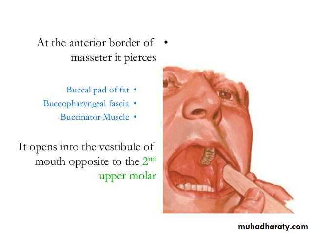 - Has broad superficial lobe and smaller deeper lobe, with facial nerve usually between both lobes- Stensen’s duct (main duct) empties into oral cavity opposite crown of second maxillary molar