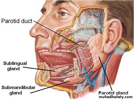 Parotid Gland- Largest salivary gland (15-30g), 6 x 3 cm