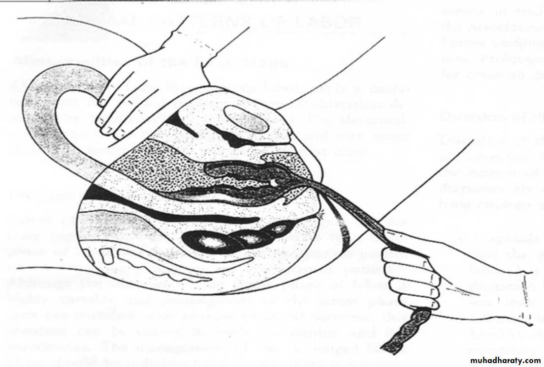 Controlled cord traction:The Placenta is delivered using one hand on umbilical cord with gentle downward traction. The Other hand should be on the abdomen to support the uterine fundus,this is the active management of third stage.