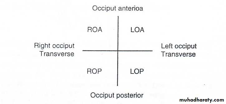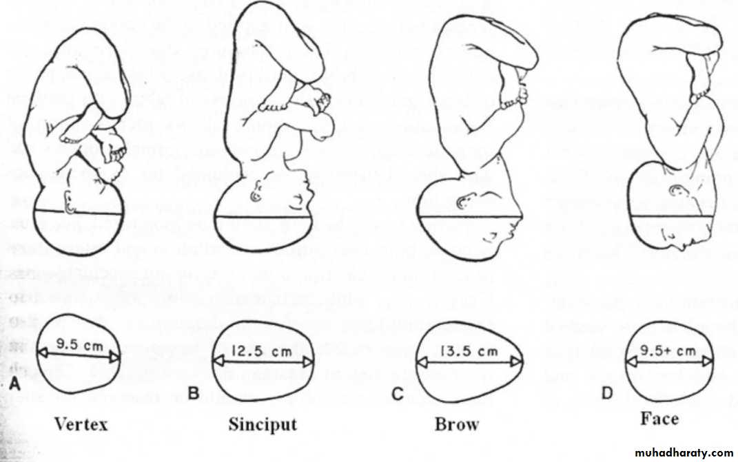 Fetal presentation – vertex, breech, shoulder, compound (vertex and hand), and funic (umbilical cord).