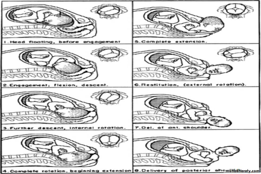 In order to be delivered, the shoulders have to rotate into the direct AP plane (remember the widest diameter at the outlet). When this occurs, the occiput rotates through a further one-eighth of a circle to the transverse position. This is called external rotation .Expulsion :-