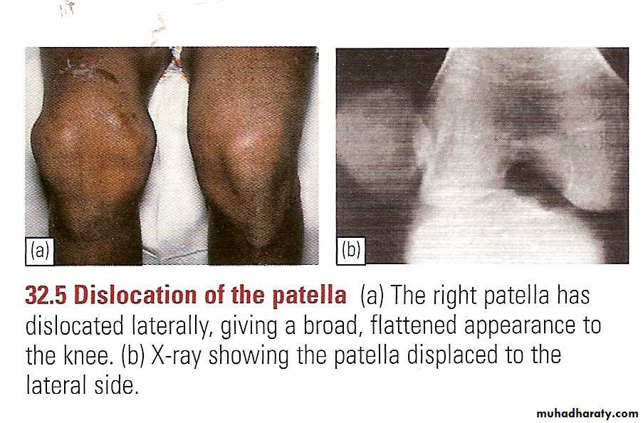 First time dislocation; tearing sensation, patient collapse on the ground.Patella may remain dislocated or springs back into position spontaneuously.