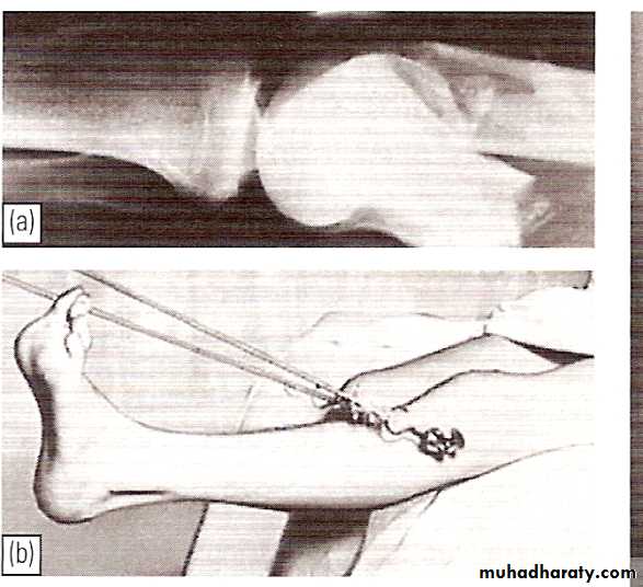 Slightly displaced #s- skeletal traction through proximal tibia.If closed reduction fails- ORIF.
