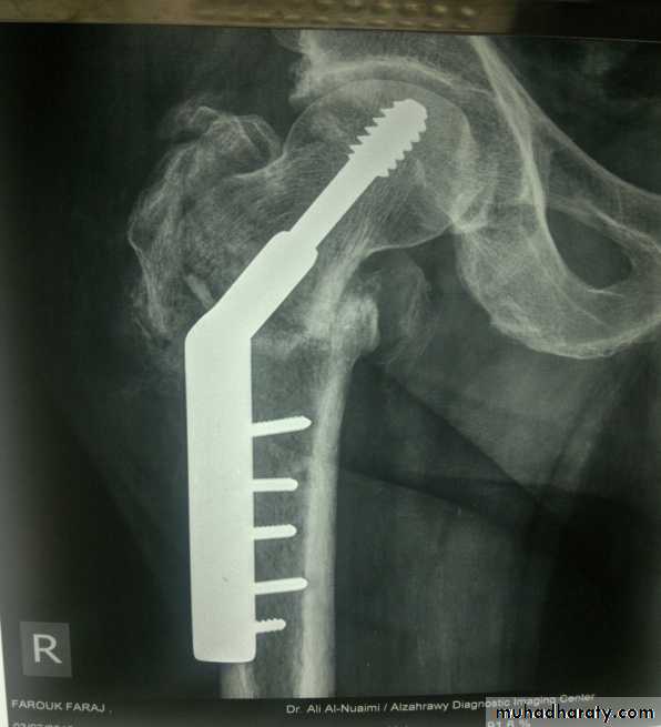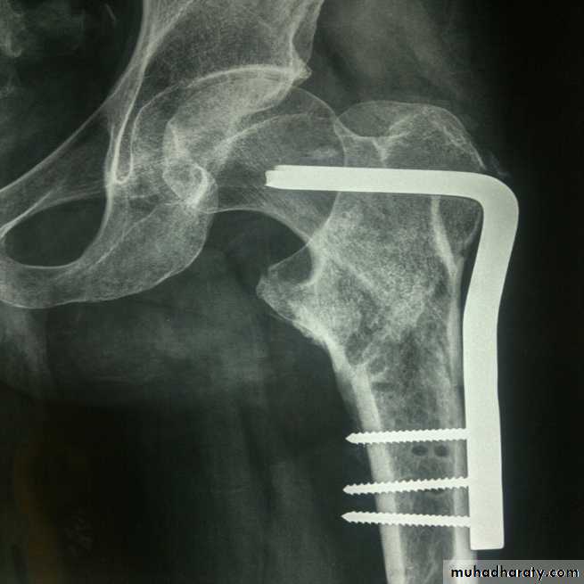 The fracture is fixed with an angled device – preferably a sliding screw in conjunction with a plate (dynamic hip screw) or