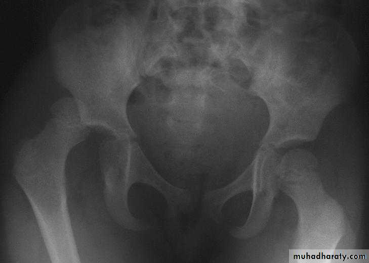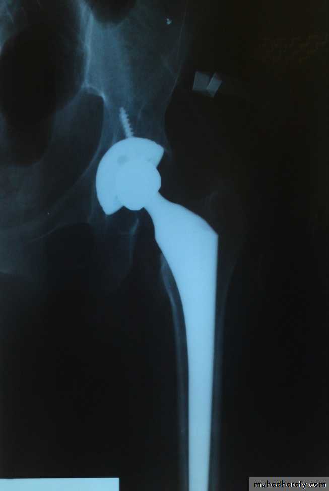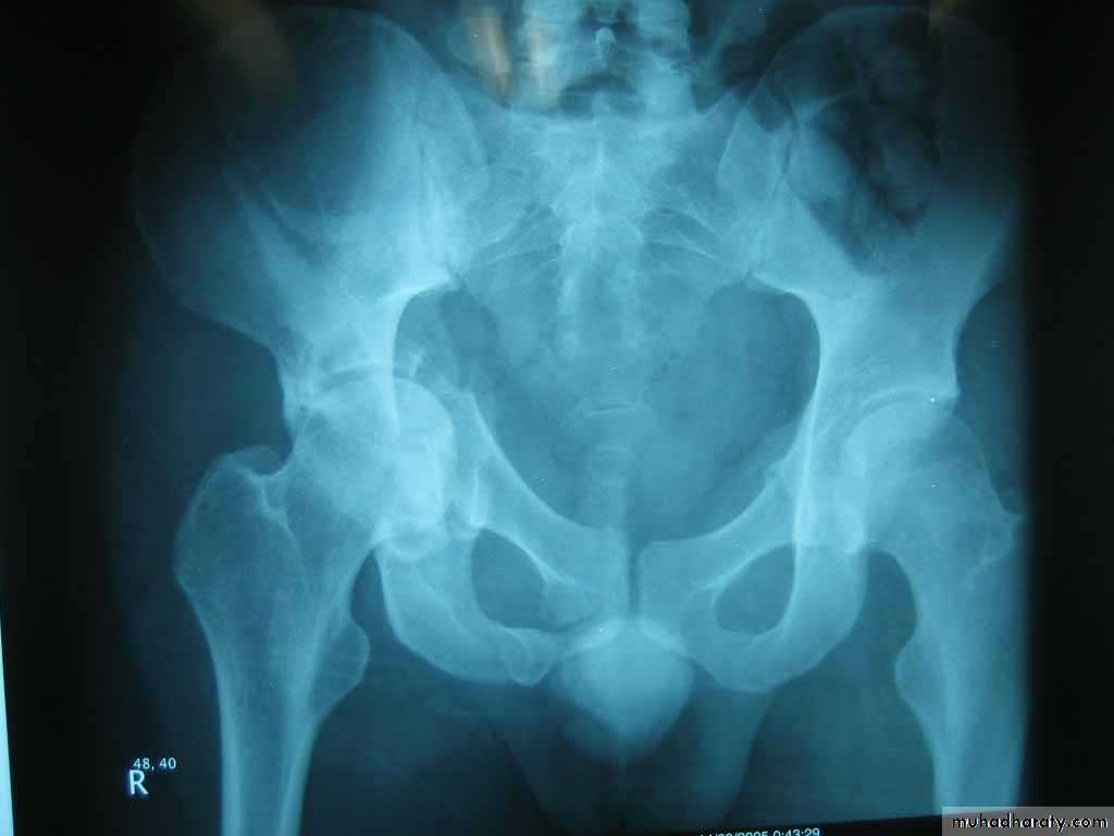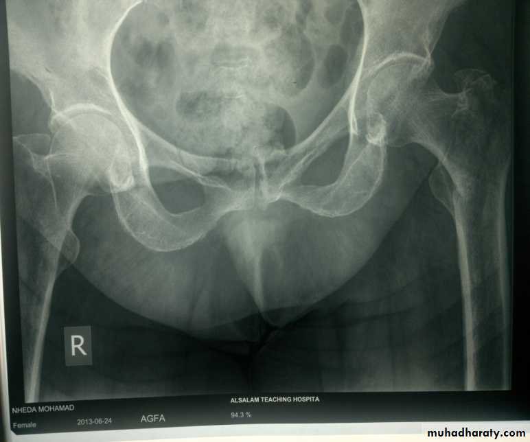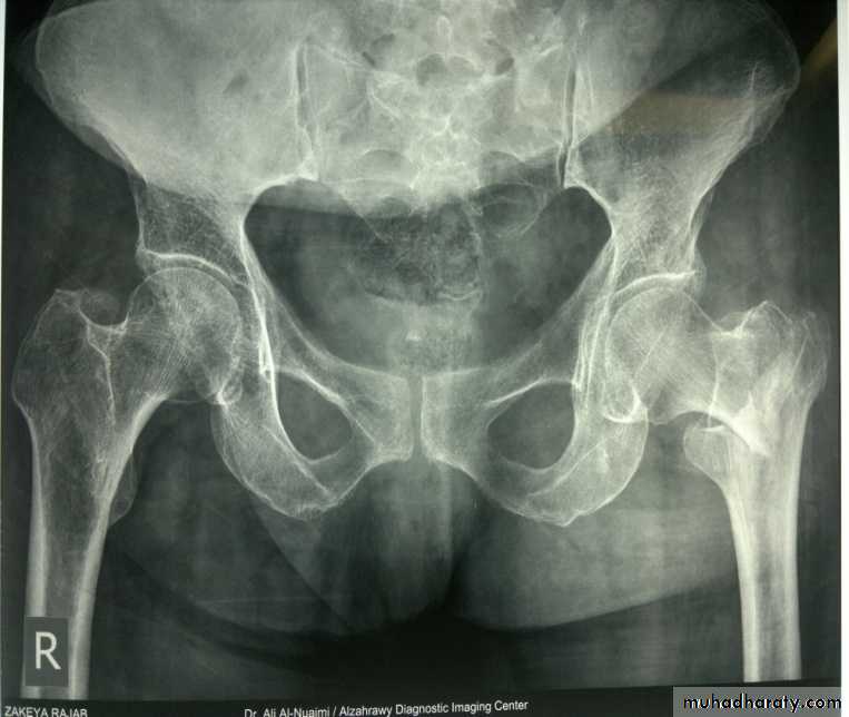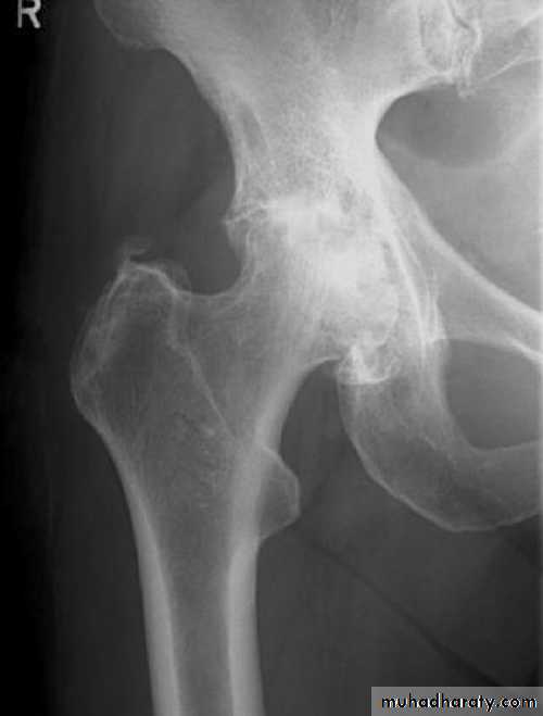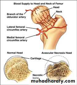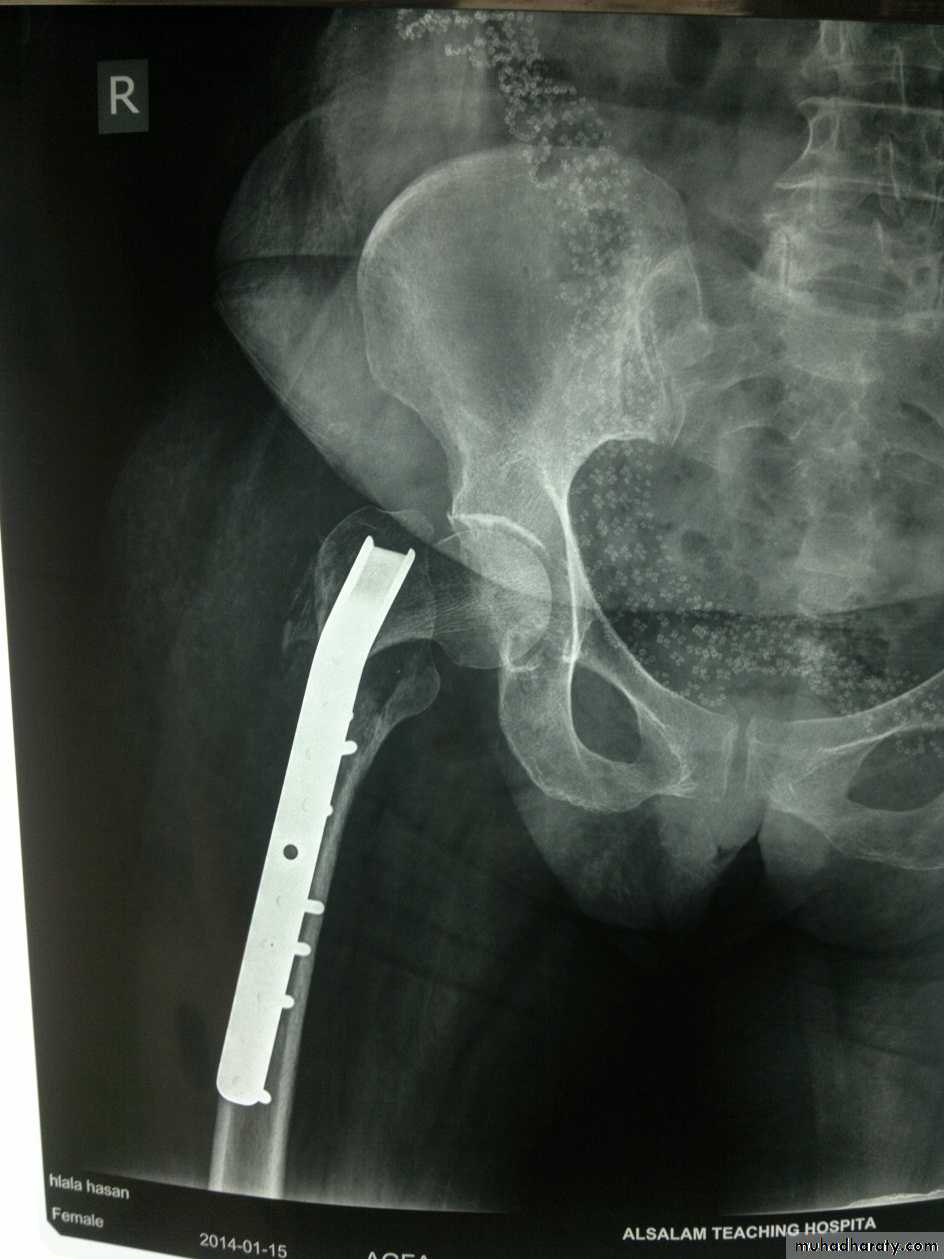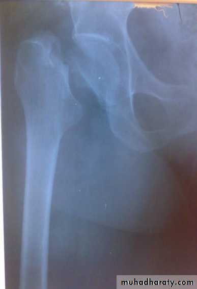 1- avascular necrosis of the femoral head ,appear in the x-ray as an increase in density of the femoral head , but it is not seen before 6 weeks and some time up to 2 years .In early weeks , bone scan and MRI will be helpful in the diagnosis of ischemia .