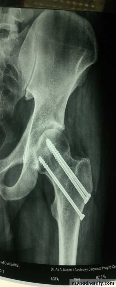 the fixation should be done by internal fixators like compression screws , plate and screws , dynamic hip screw ……etc .