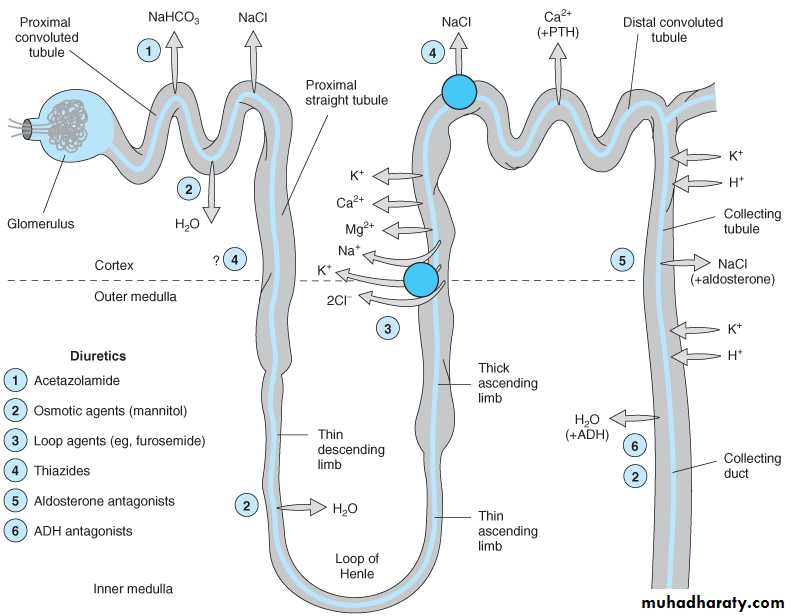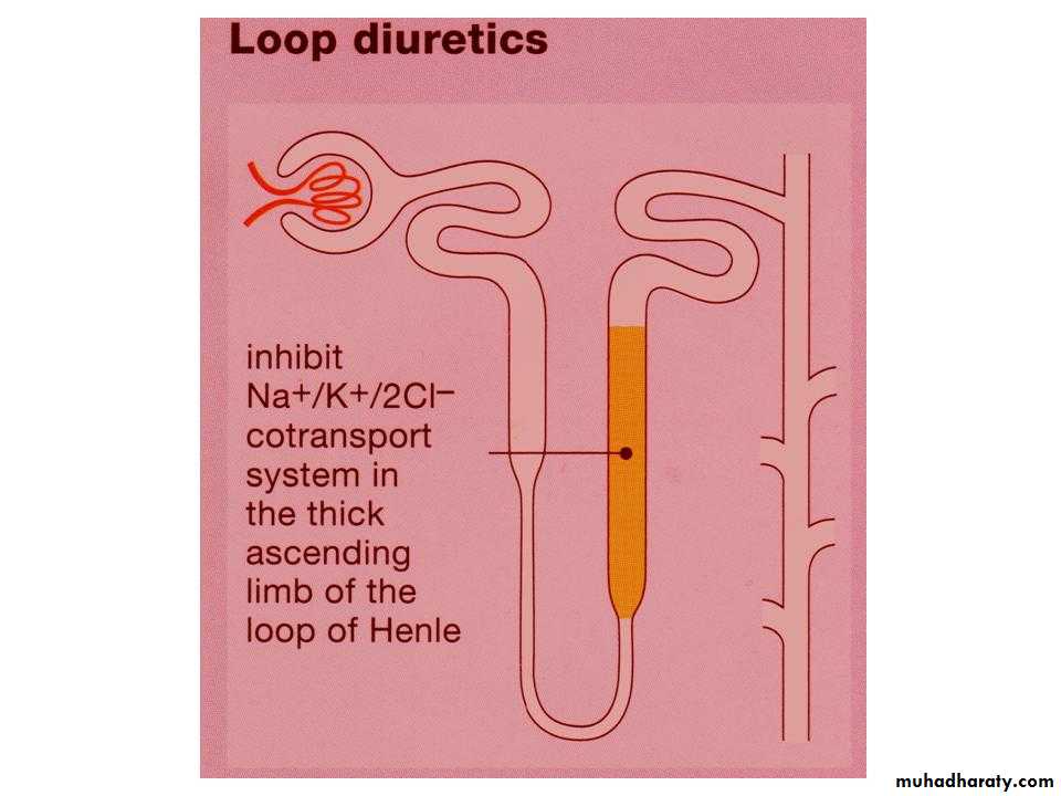 Since the ALOH responsible for reabsorption of 25-30% of filterd Nacl, and the downstream sites cannot able to compensate for this increased Na+ load, the loop diuretics are the most efficacious agents . In addition to their diuretic activity, loop agents have direct effects on blood flow through several vascular beds by inducing the synthesis of prostaglandins, both furosemide and ethacrynic acid have also been shown to reduce pulmonary congestion and left ventricular filling pressures in heart failure before a measurable increase in urinary output occurs.
