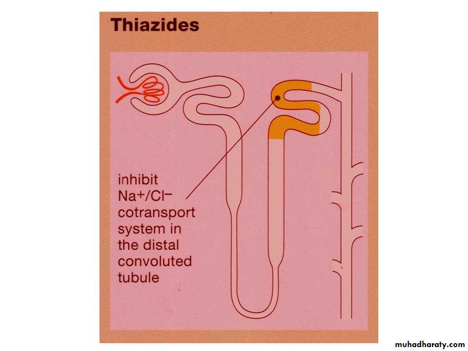 The thiazide diuretics are the most widely used of the diuretics drugs, thiazides inhibit NaCl transport predominantly in the DCT by different mechanisms. The prototypical thiazide is hydrochlorothiazide.