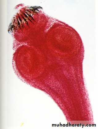 2. Adult worms consist of a head , neck and segmented body (proglottids) may reach thousands.