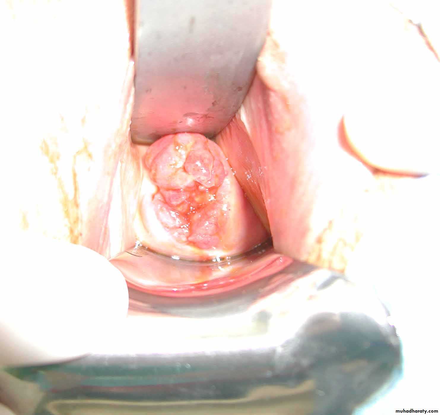 Cancer may appear as a fun gating, cauliflower – like growth which may completely fill the vagina or more commonly as an ulcer on the cervix. Cancer may expand cervix into barrel shaped.