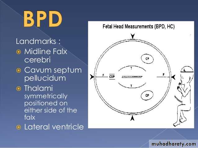 The BPD should be measured on an axial plane that traverses the thalami, and cavum septum pellucidum. The transducer must be perpendicular to the central axis of the head, and thus the hemispheres and calvaria should appear symmetric.