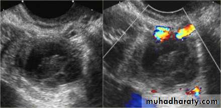classic sonographic appearance is that of a solid collection of echoes with numerous small (3-10 mm) anechoic spaces (snowstorm appearance).