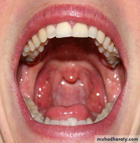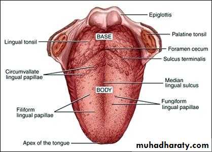 The mucous membrane of the upper surface of the tongue can be divided into anterior and posterior parts by a V-shaped sulcus, the sulcus terminals. The apex of the sulcus projects backward and is marked by a small pit, the foramen cecum. The sulcus serves to divide the tongue into the anterior two thirds, or oral part, and the posterior one third, or pharyngeal part. The foramen cecum is an embryologic remnant and marks the site of the upper end of the thyroglossal duct. Three types of papillae are present on the upper surface of the anterior two thirds of the tongue: the filiform papillae, the fungiform papillae, and the vallate papillae.The mucous membrane covering the posterior third of the longue is devoid of papillae but has an irregular surface, caused by the presence of underlying lymph nodules, the lingual tonsil. The mucous membrane on the inferior surface of the tongue is reflected from the tongue to the floor of the mouth. In the midline anteriorly, the undersurface of the tongue is connected to the floor of the mouth by a fold of mucous membrane, the frenulum of the tongue. On the lateral side of the frenulum, the deep lingual vein can be seen through the mucous membrane. Lateral to the lingual vein, the mucous membrane forms a fringed fold called the plica fimbriata
