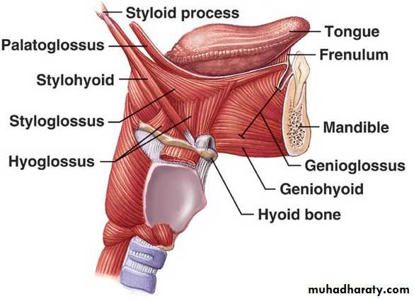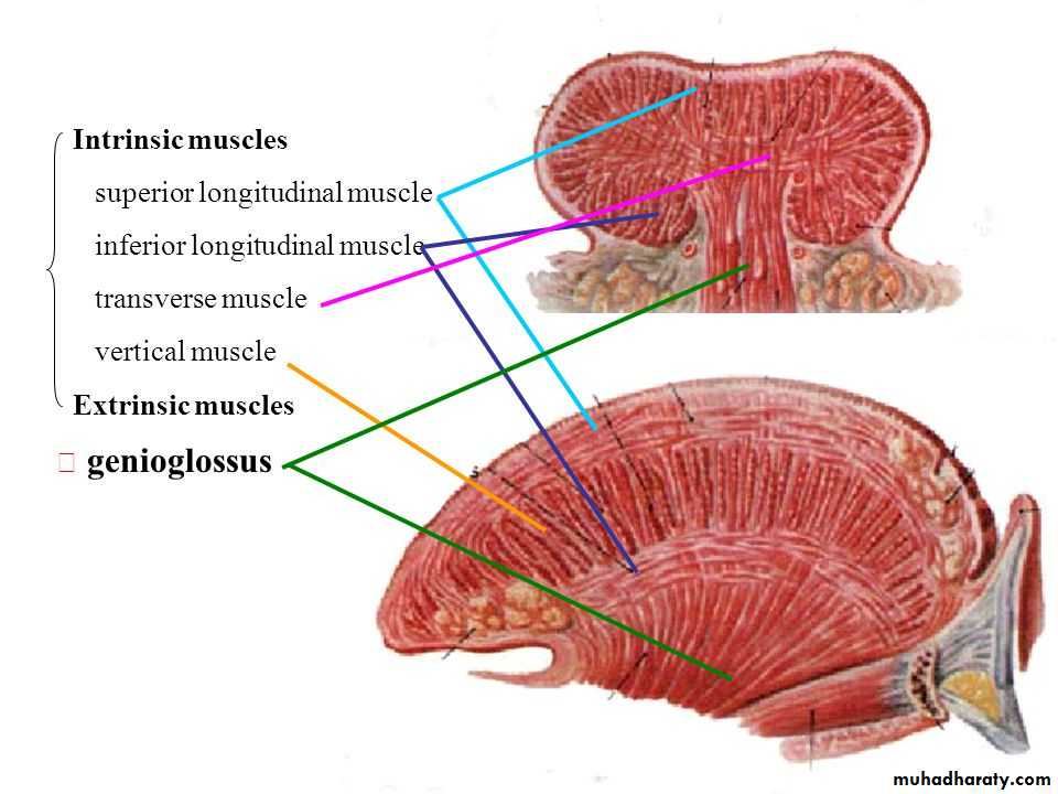 The muscle of the tongue are divided into 2 types: intrinsic and extrinsicIntrinsic Muscles :