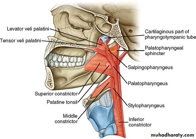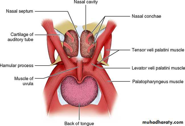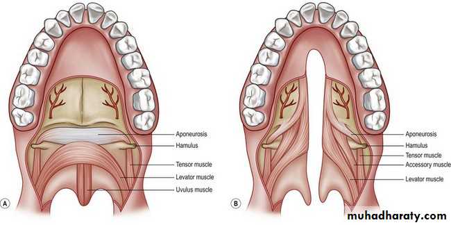 The muscle fibers of the tensor veli palatini converge as they descend from their origin to form a narrow tendon, which turns medially around the pterygoid hamulus, The tendon, together with the tendon of the opposite side, expands to form the palatine aponeurosis. When the muscles of the two sides contract, the soft palate is tightened so that the soft palate may be moved upward or downward as a tense .