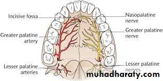 The greater and lesser palatine nerves from the maxillary division of the trigeminal nerve enter the palate through the greater and lesser palatine foramina .The nasopalatine nerve, also a branch of the maxillary nerve, enters the front of the hard palate through the incisive foramen. The glossopharyngeal nerve also supplies the soft palate.Blood Supply of the Palate :