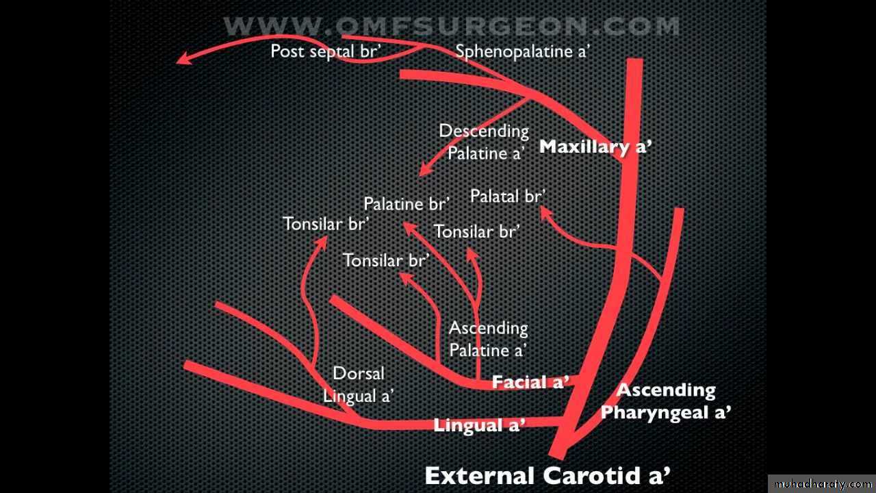 The greater palatine branch of the maxillary artery, the ascending palatine branch of the facial artery, and the ascending pharyngeal artery .Lymph Drainage of the Palate:
